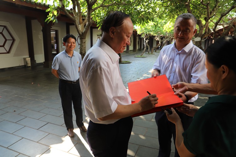 近三小时的参观,朱善璐会长满怀敬意、深受感动。临别之际,欣然命笔写下了“播火海南,源起琼台”,赞美我校在海南红色文化传承与发展方面所做的贡献!