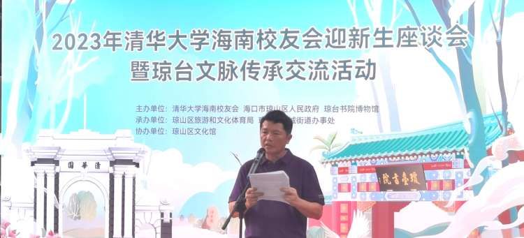 本次活动由清华大学海南校友会、海口市琼山区人民政府、琼台书院博物馆主办,琼山区旅游和文化体育局、琼山区府城街道办事处承办,琼山区文化馆协办的2023 年海口市琼山区“文脉绵延 古韵新生”清华大学海南校友会迎新生座谈会暨琼台文脉传承交流活动在琼台书院举行。清华大学海南校友会会长吴坤平、清华大学海南招生组组长许斌 、琼山区旅游和文化体育局局长林先锋、琼台书院博物馆负责人杨艳红等领导参与活动。