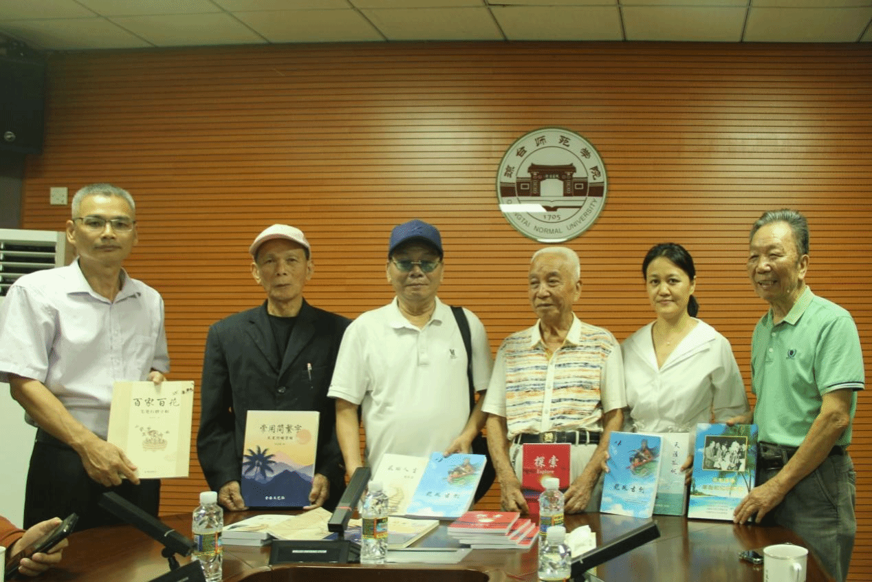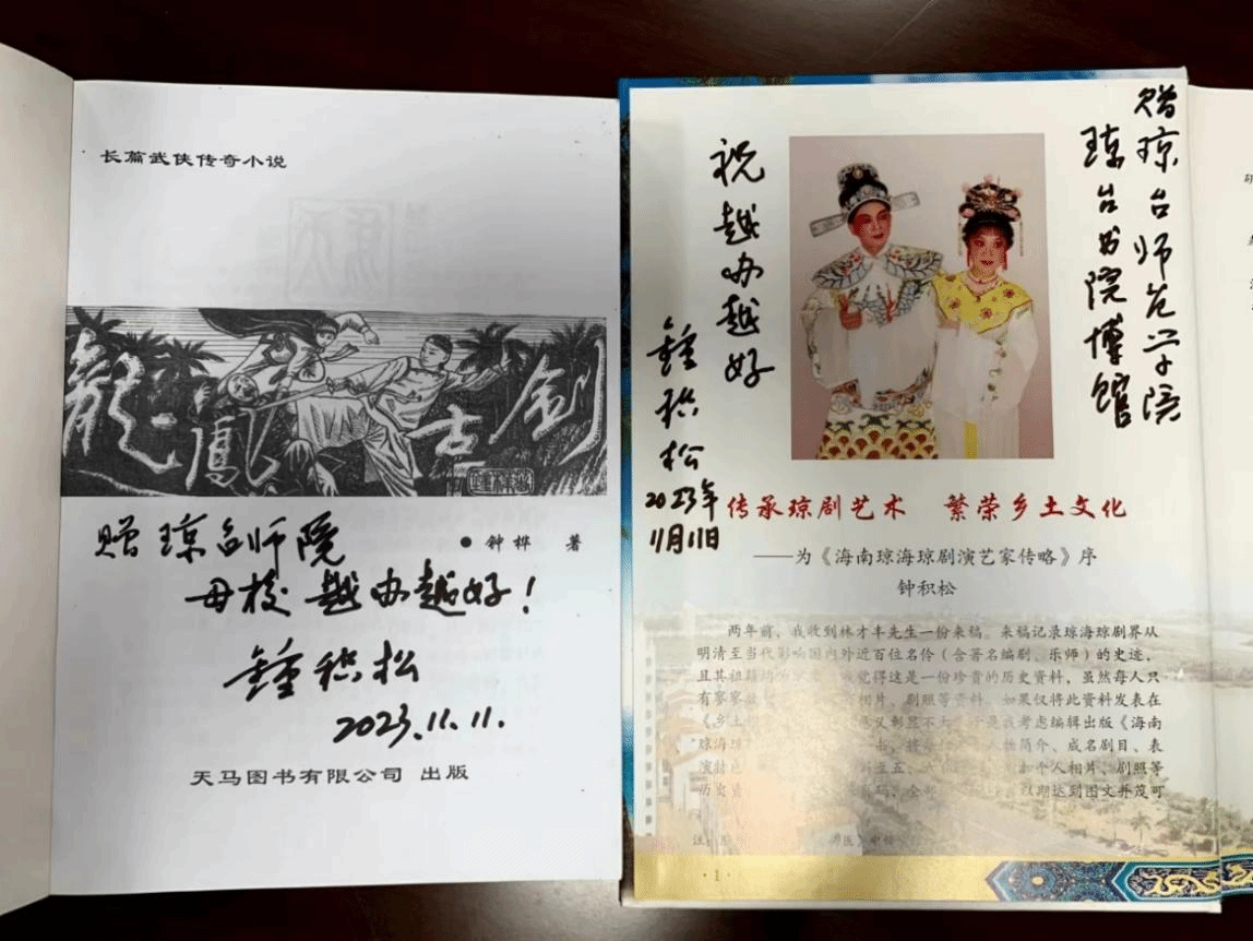 参观结束后,琼台书院博物馆副馆长杨艳红在会议室接待返校校友。钟积松(兄桦)、冯朝阳、符忠海三位校友向母校赠送著作,并在赠送的著作上为学校题词祝福,表达了对母校美好的祝愿。
