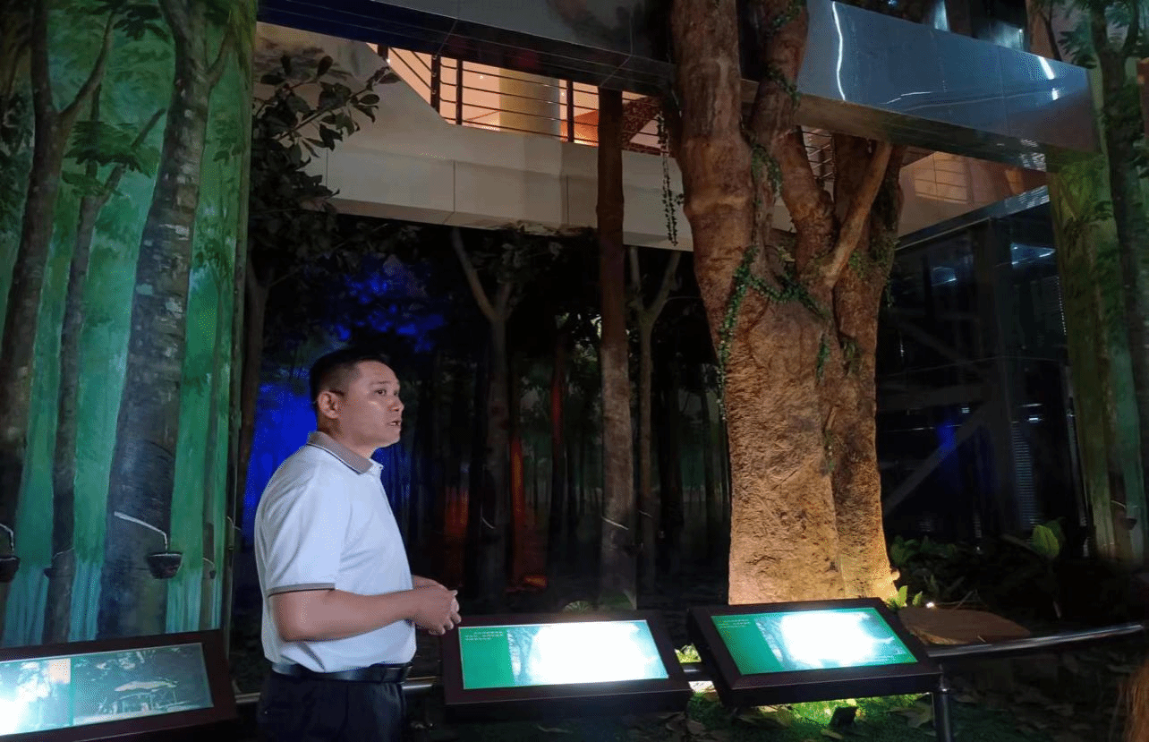 跟随讲解员来到二楼,进入到橡胶的世界。讲解员讲道橡胶作为重要的战略物资,美英帝国主义已对我国进行封锁,为保证国防及工业建设的需要必须争取橡胶自给自足。正是沙墙壁画中的五大群体,他们为海南岛的橡胶种植付出了不可磨灭的贡献,为国防物资安全作出了无畏开拓的付出。