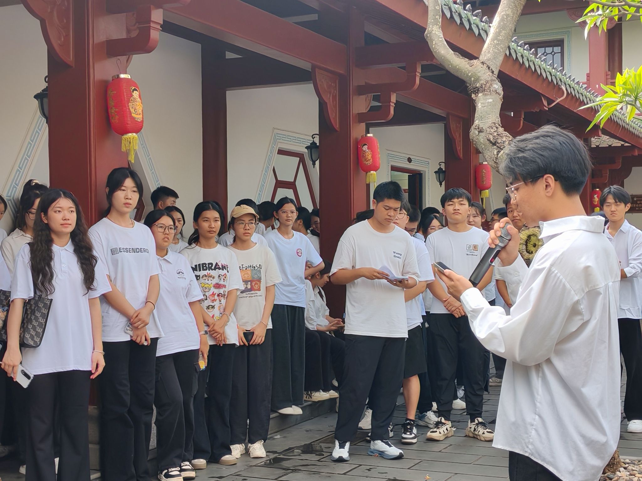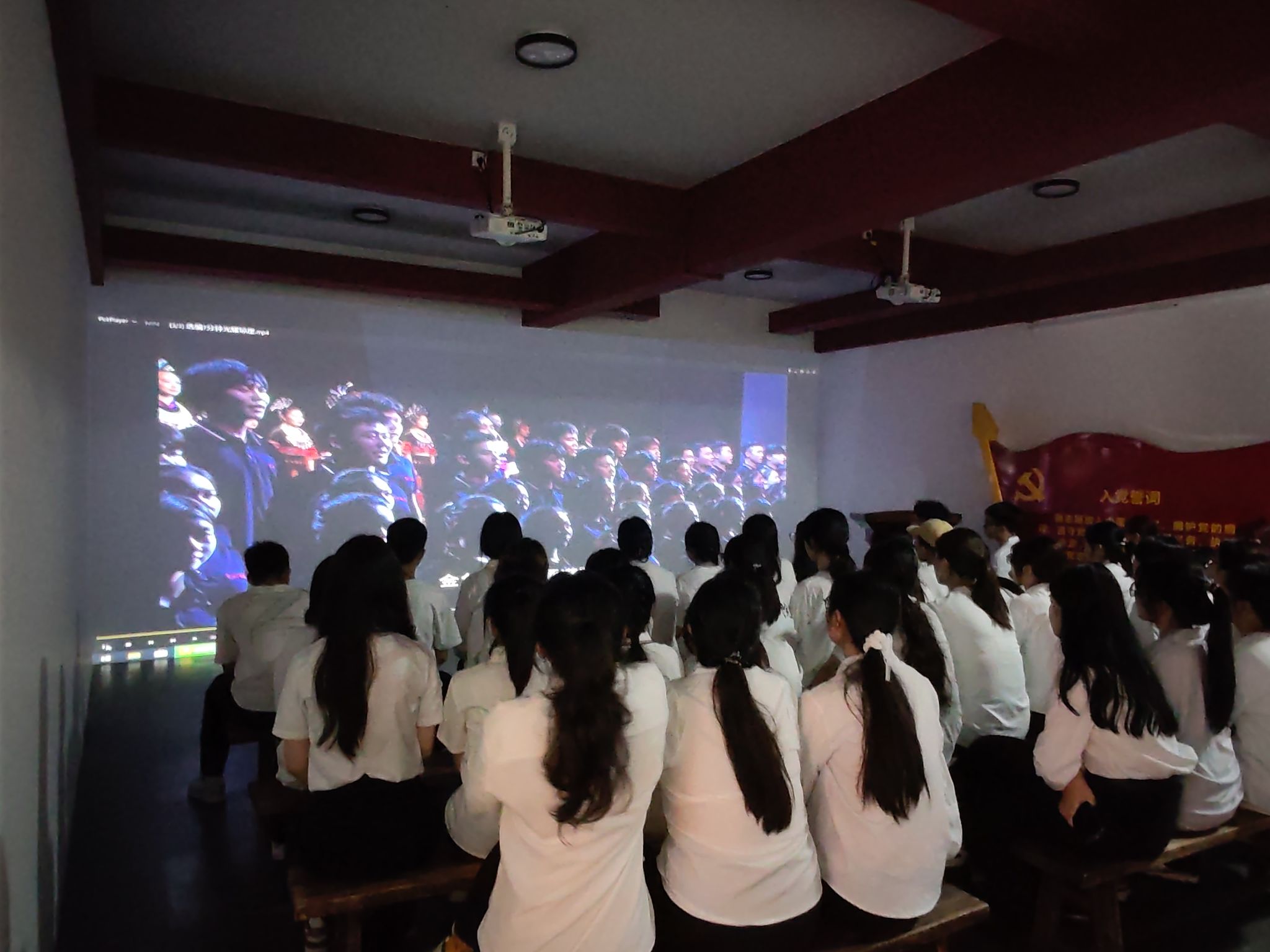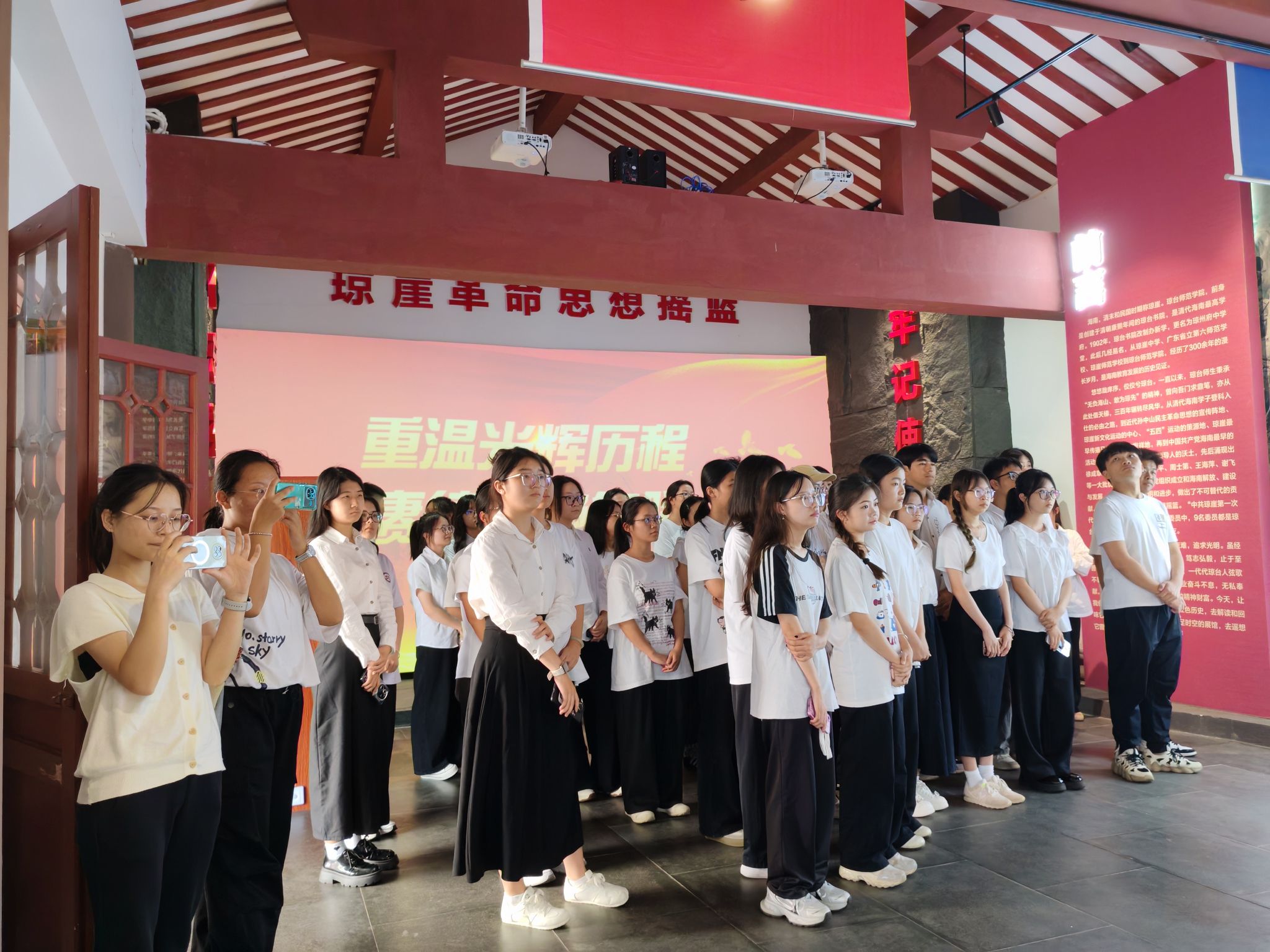 活动启幕,同学们跟随讲解员的脚步,一同参观学习“琼台:琼崖革命思想摇篮”主题教育展和“琼州文脉:琼台书院历史文化展”。琼台书院的百年书香与革命火种交相辉映,珍贵的史料镌刻着革命先辈的热血印记,让大家在感受书院深厚文化底蕴的同时,深刻领会党的政治准则与革命精神。红色影片放映时,历史画卷重现,爱国情怀与对党的崇敬在光影中升华。