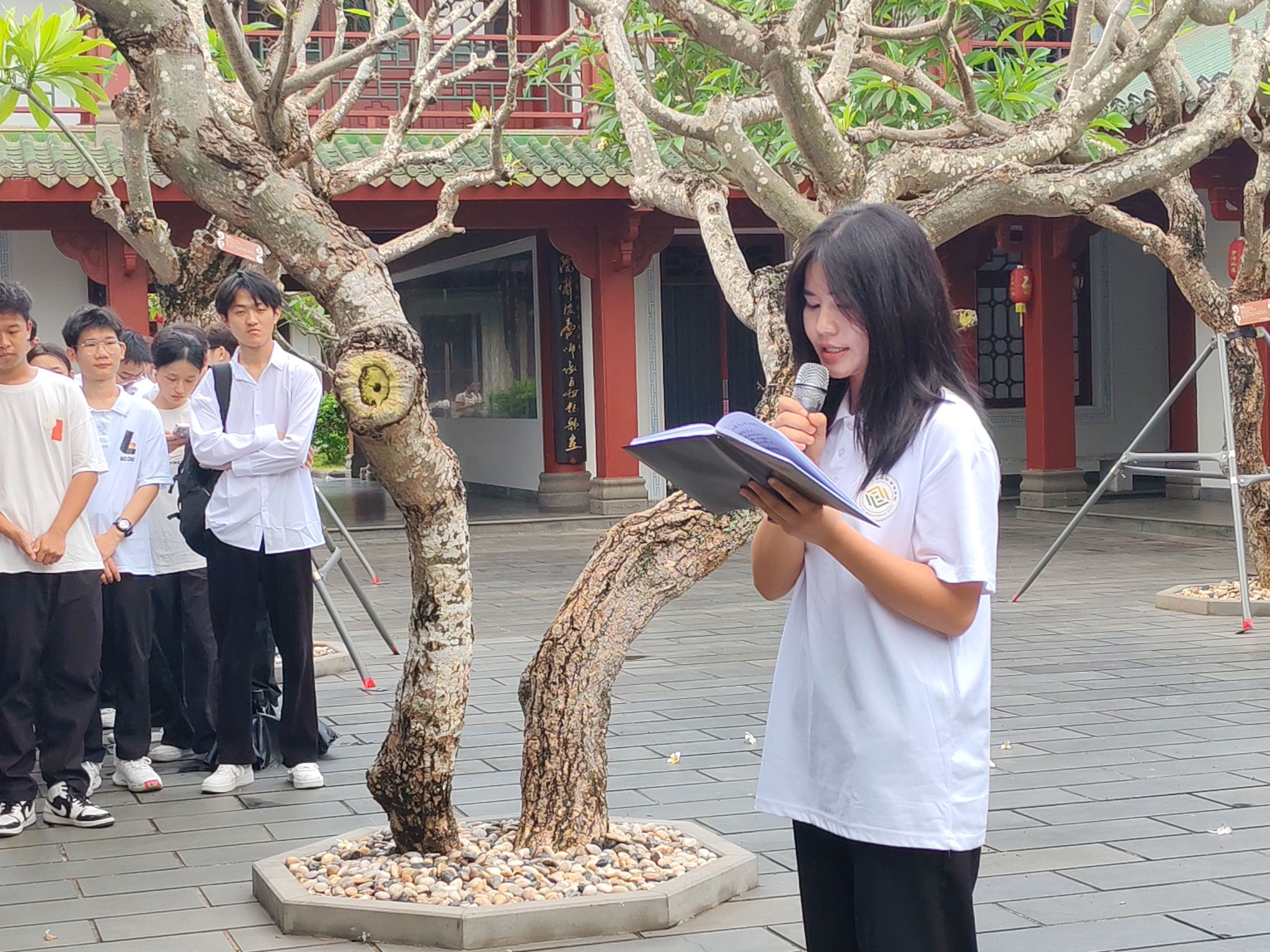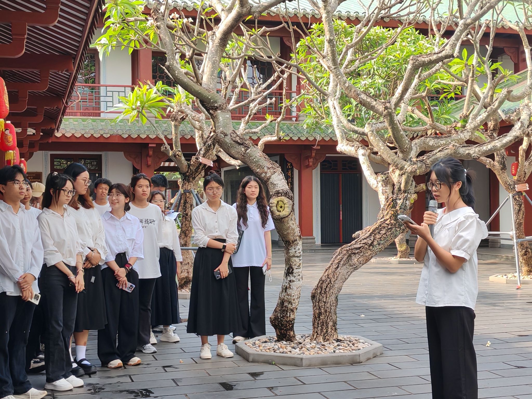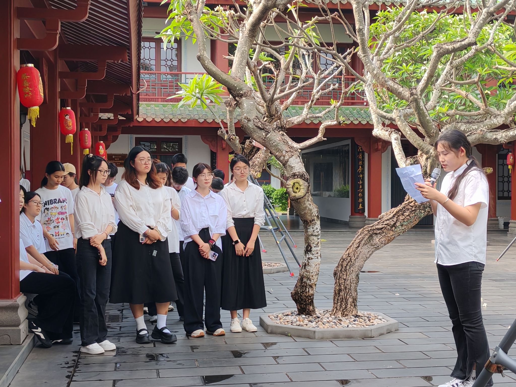 活动启幕,同学们跟随讲解员的脚步,一同参观学习“琼台:琼崖革命思想摇篮”主题教育展和“琼州文脉:琼台书院历史文化展”。琼台书院的百年书香与革命火种交相辉映,珍贵的史料镌刻着革命先辈的热血印记,让大家在感受书院深厚文化底蕴的同时,深刻领会党的政治准则与革命精神。红色影片放映时,历史画卷重现,爱国情怀与对党的崇敬在光影中升华。