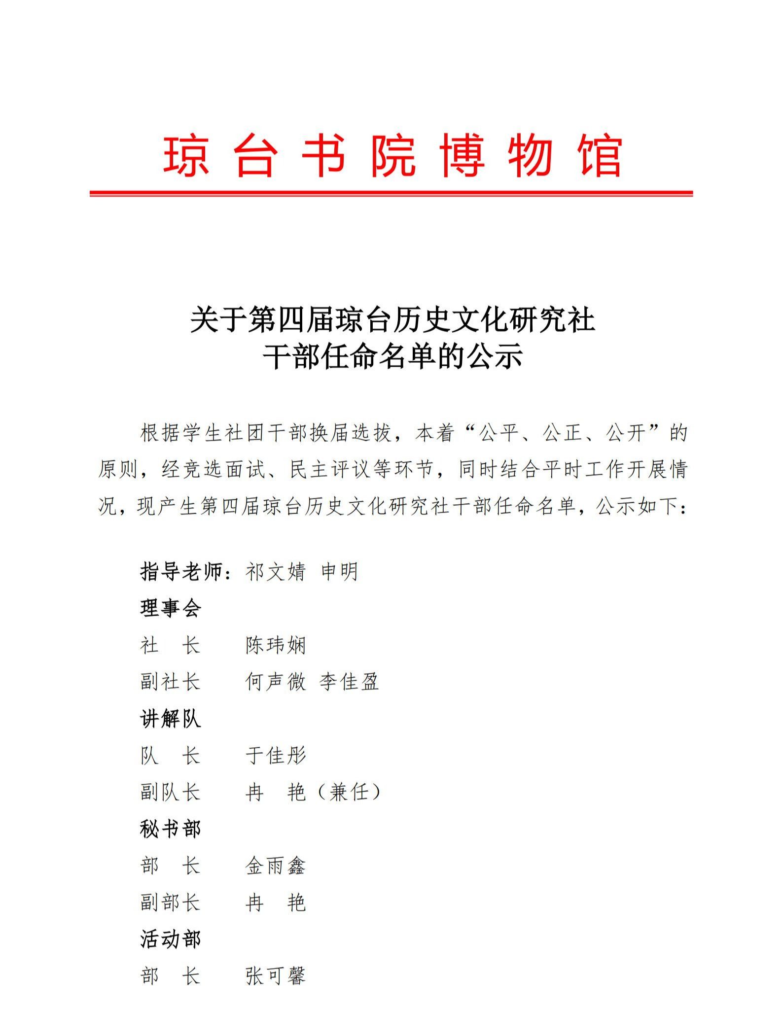 关于第四届琼台历史文化研究社干部任命名单的公示