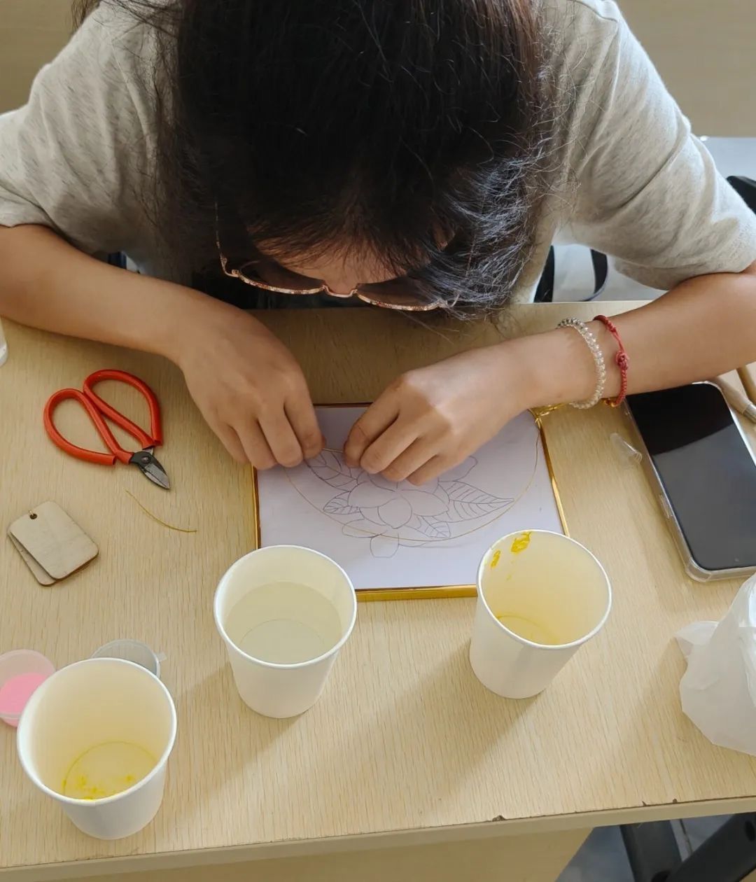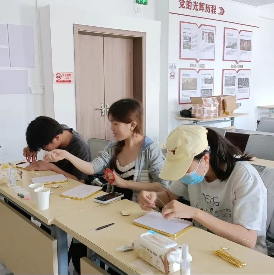 紧接着,我们开始实操,我们拿起工具,仿佛化身为匠人,一丝不苟地绘制图稿、精细掐丝、色彩点蓝……每一个步骤都凝聚着我们的专注与热情。在动手的过程中,我们不仅学会了技艺,更感受到传统文化的温度。