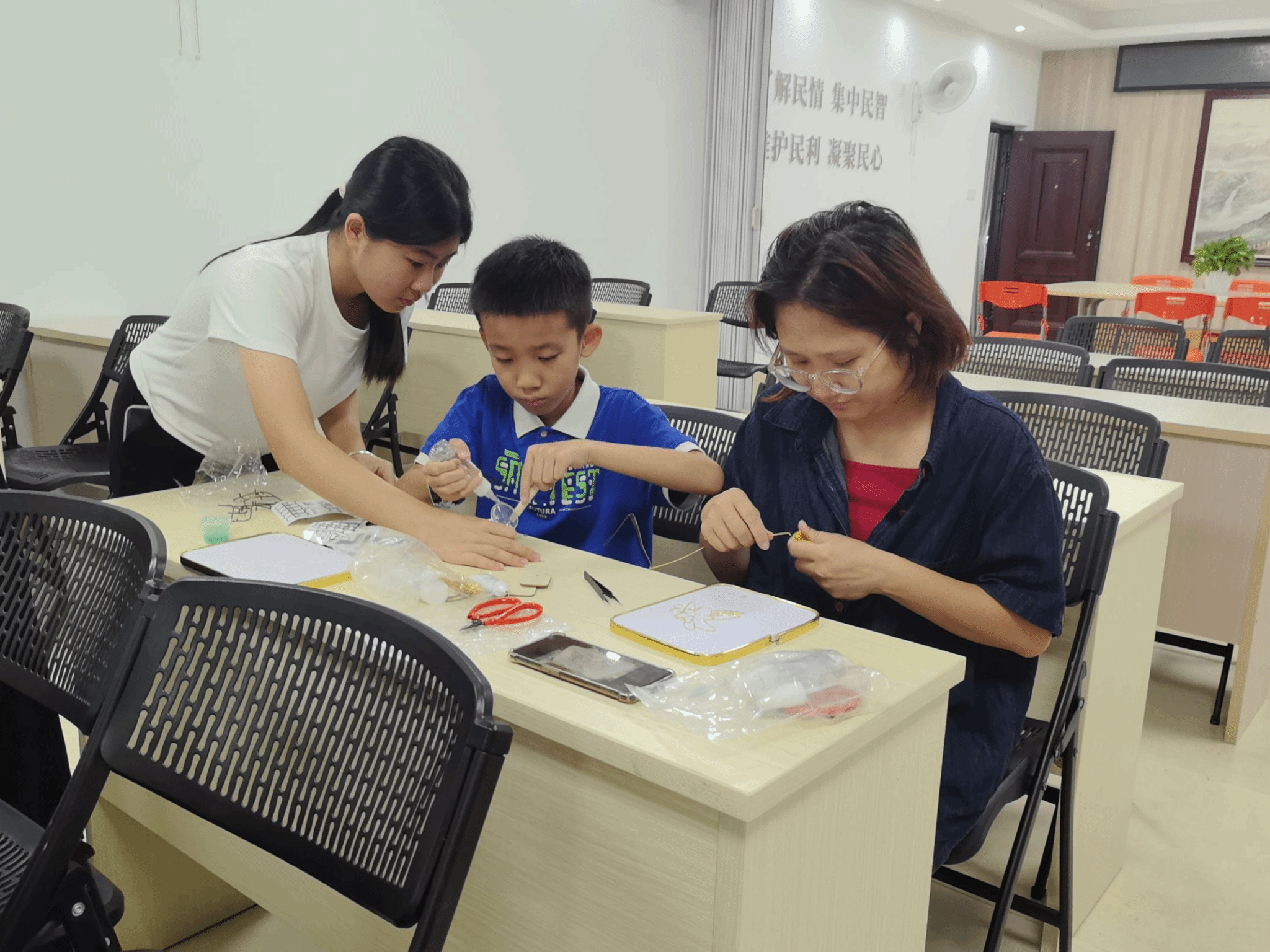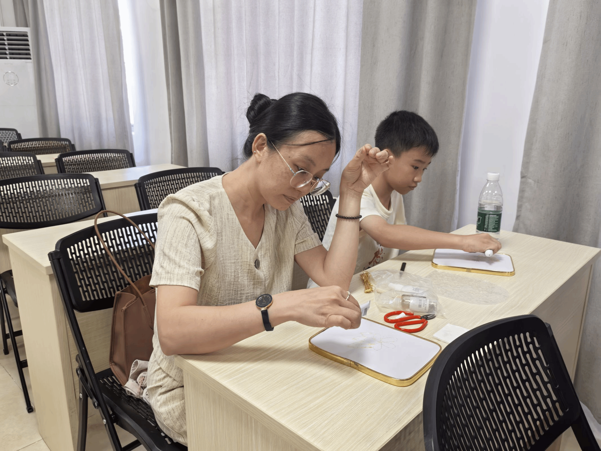 为了让青少年深入了解掐丝珐琅工艺,志愿者们精心准备了PPT和视频,详细讲解了从金属丝掐制到珐琅彩料填充的每一道工序,展现了传统技艺的精妙与匠心。讲解结束后,大家迎来了期待已久的动手体验环节。青少年们积极参与,在亲身制作中感受非遗工艺的独特魅力,并在交流讨论中进一步加深了对琼台书院文化的认识。